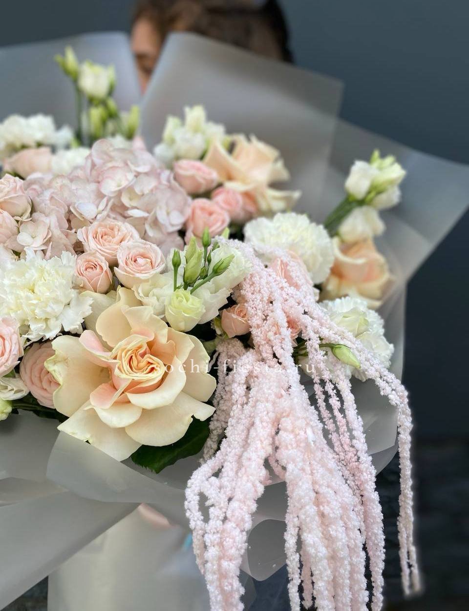 Монохромная палитра с многослойной структурой. Французские розы и эустомы чередуются с кустовыми бутонами, гортензии заполняют объём, а диантусы создают точечные акценты. Букет выглядит цельно и графично.