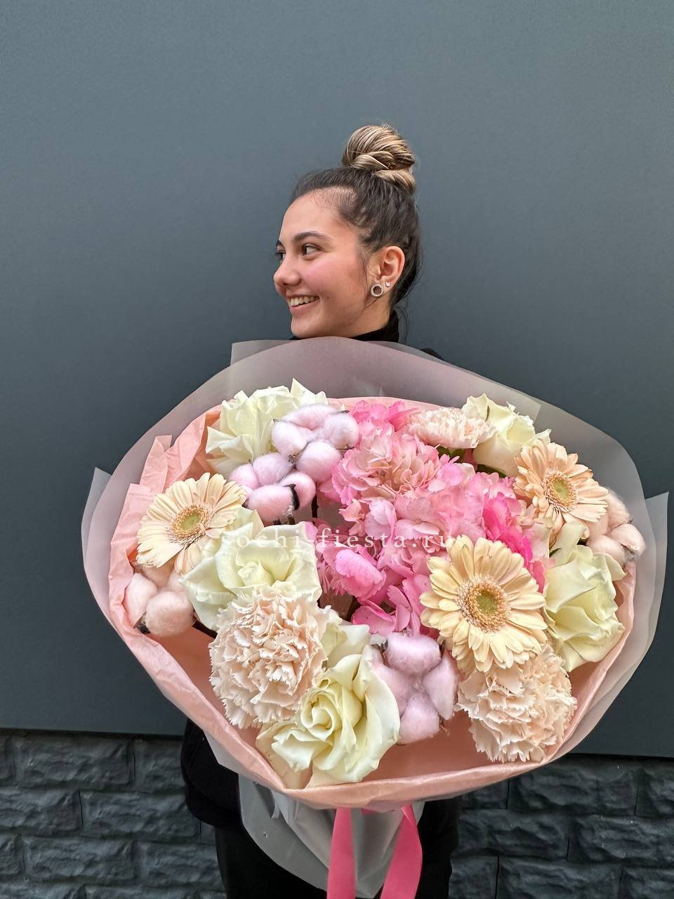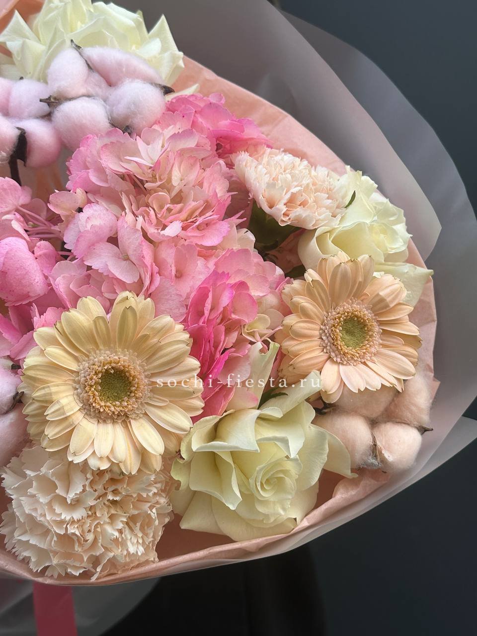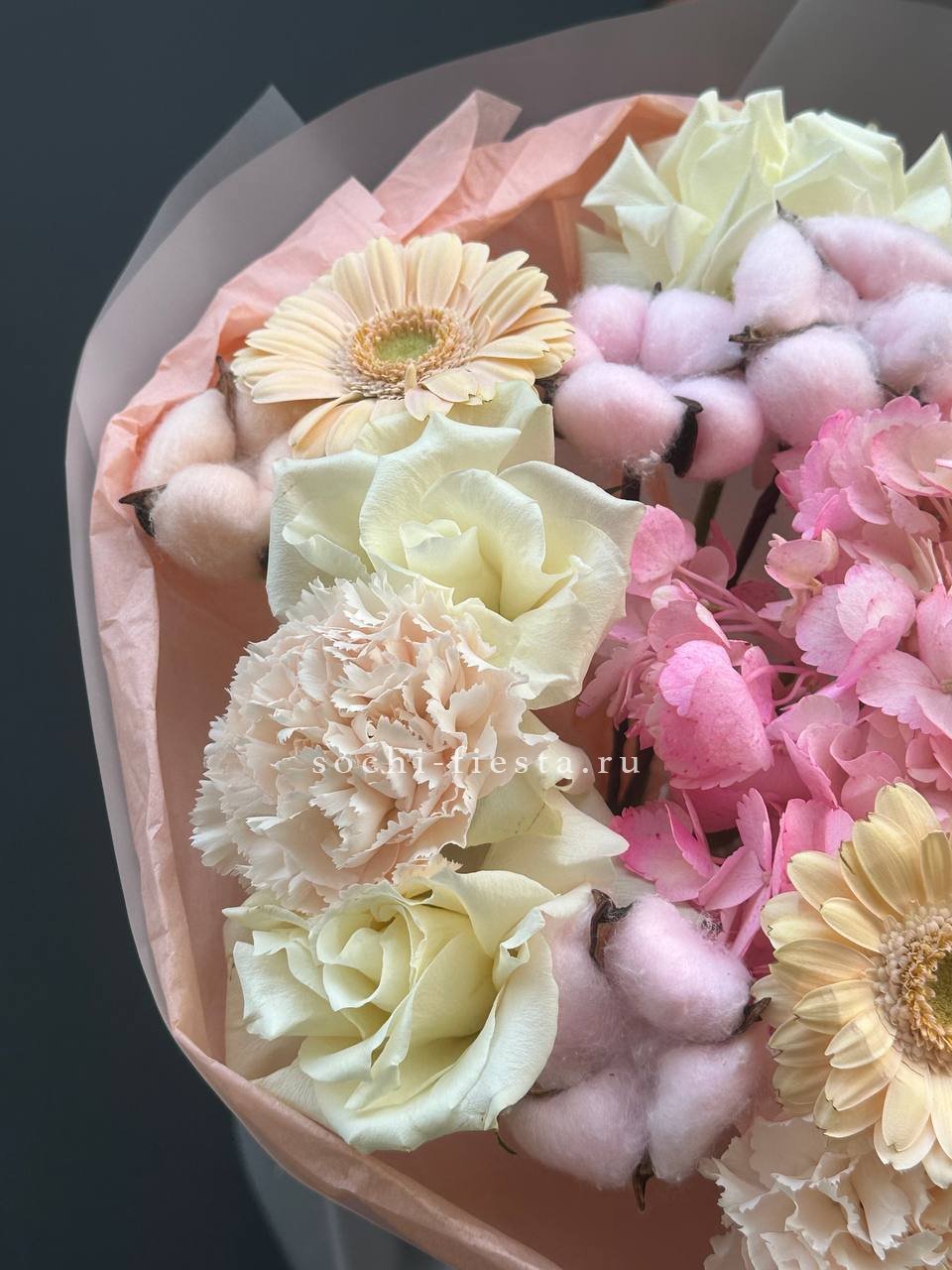 гортензия, герберы, розы, диантусы, хлопок,  авторское оформление.