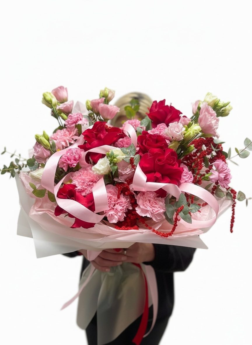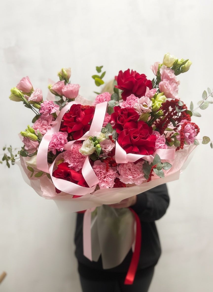 Пышный авторский микс, в котором глубокий красный цвет роз гармонично дополнен зефирными оттенками диантусов и кустовых роз. Это не просто букет, а масштабное признание, которое заставляет сердце биться чаще. Подарите незабываемый WOW-эффект той, кто вам по-настоящему дорога!