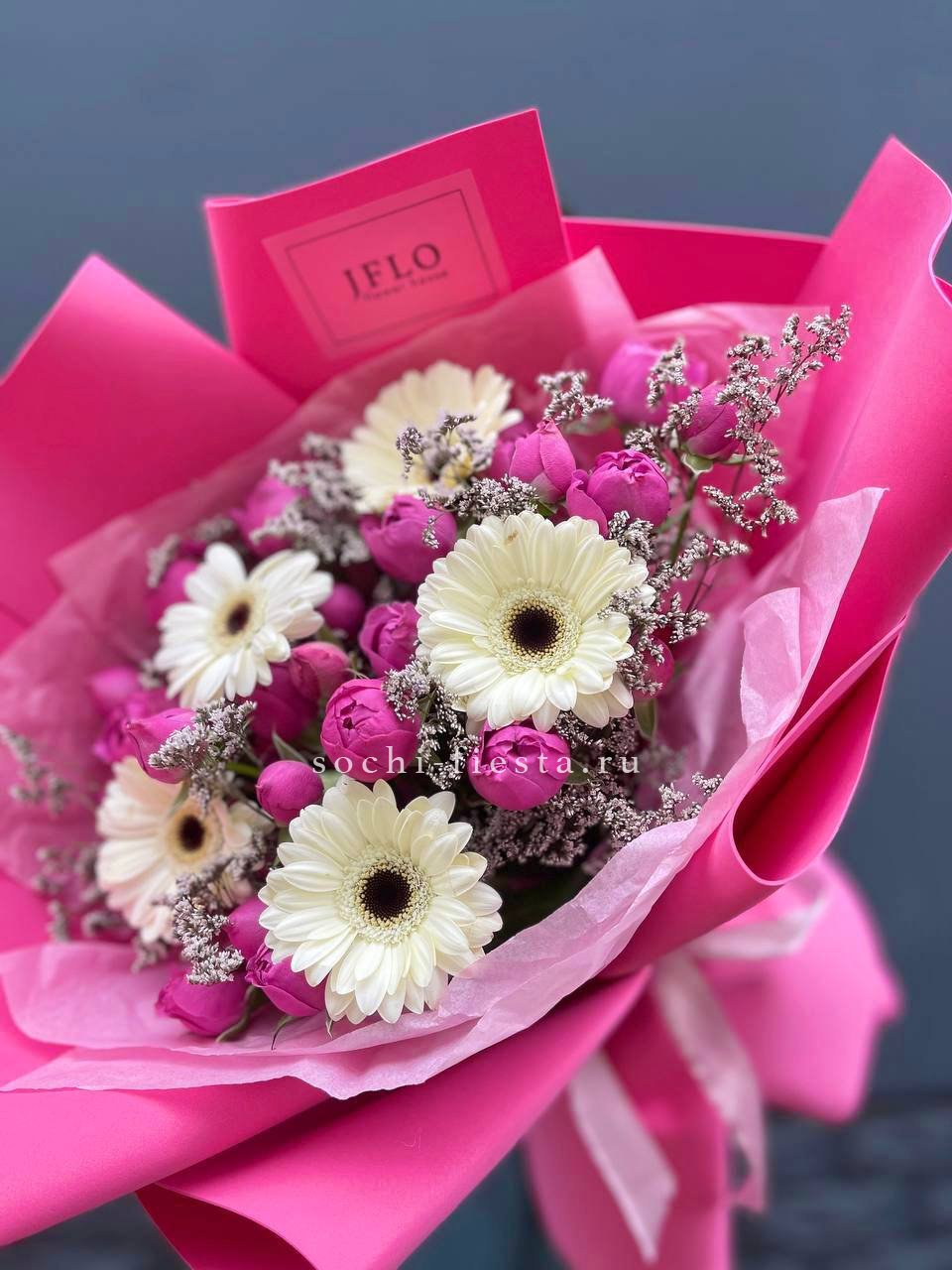 В центре внимания — фактуры и цвет! Современный, стильный букет, который сочетает бархатистые бутоны роз и мягкий хлопок. Это не просто цветы, а целая цветочная композиция для тех, кто ценит красоту в деталях. Отличный повод порадовать себя или близких!