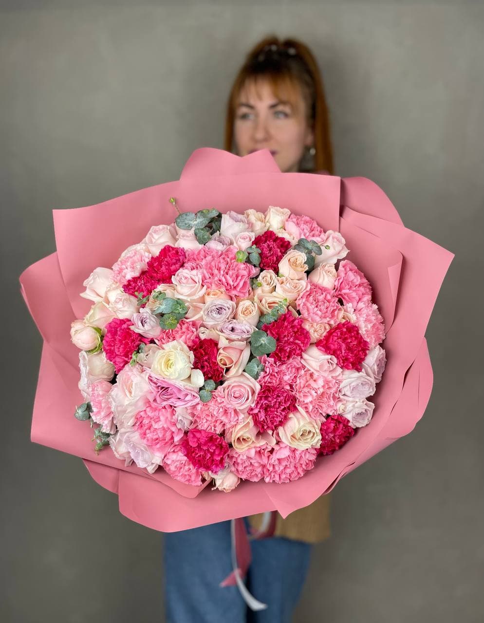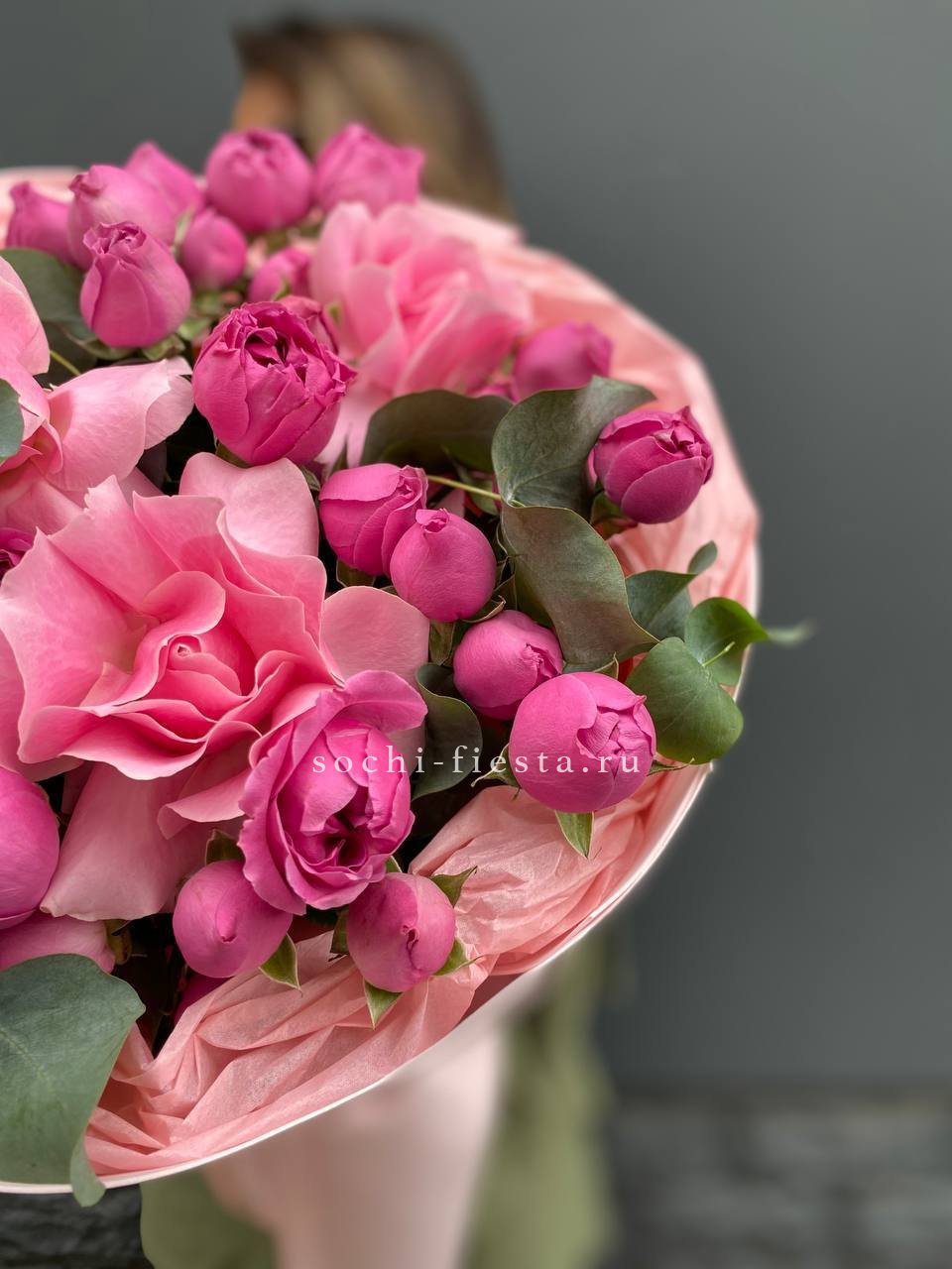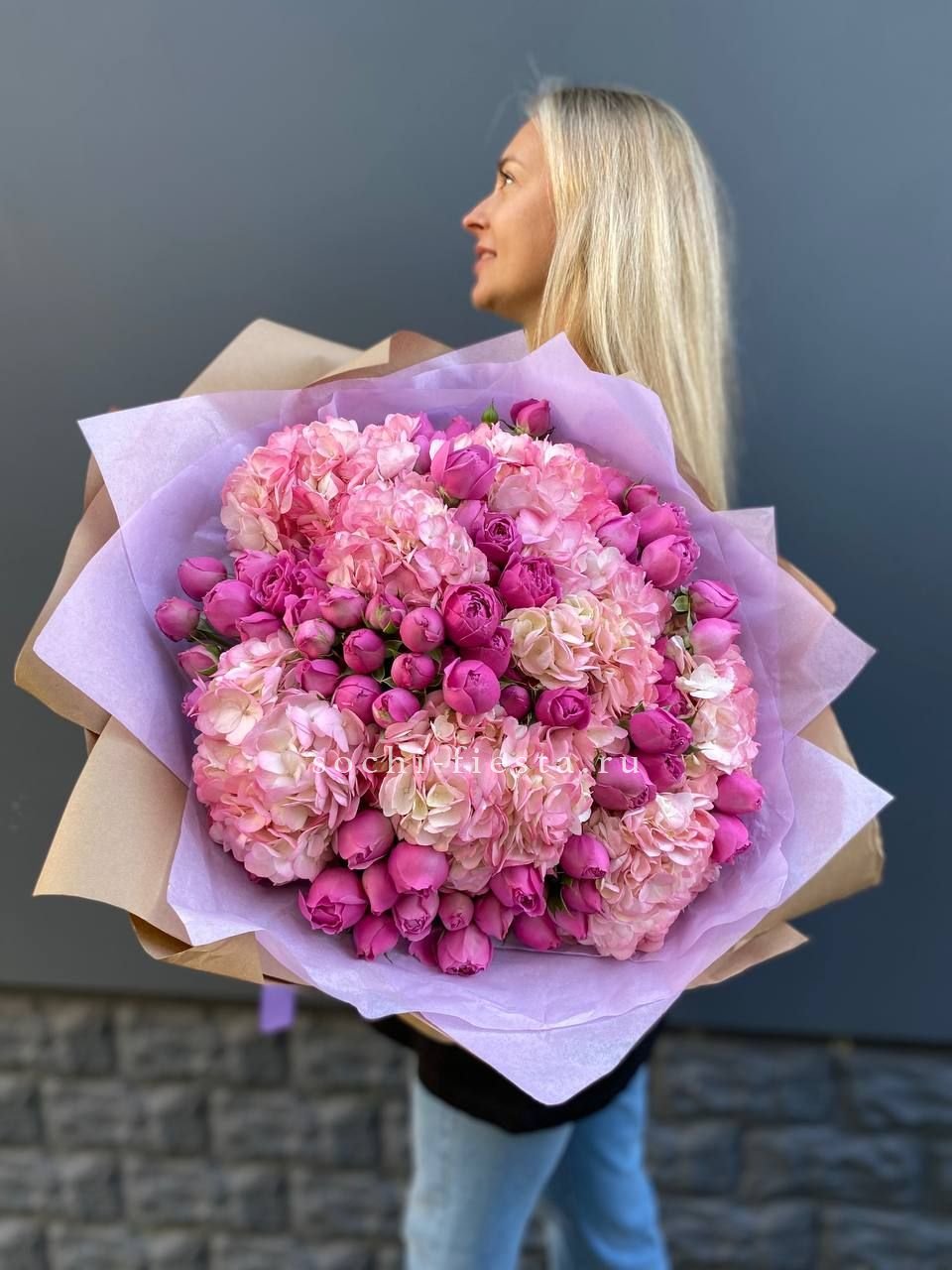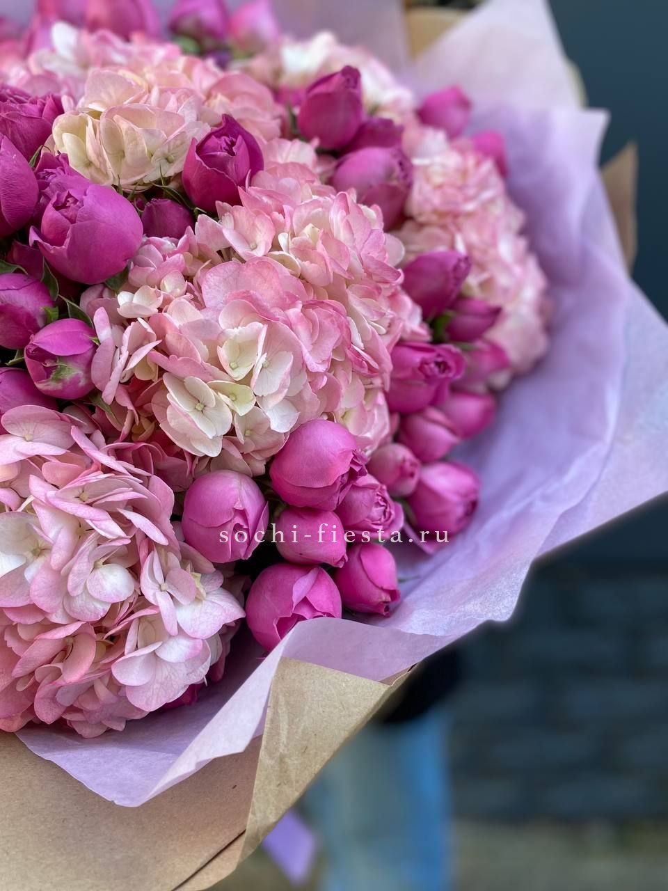 гортензия, пионовидная кустовая роза,  розовая роза, хризантема,  эвкалипт, лента, дизайнерская пленка.