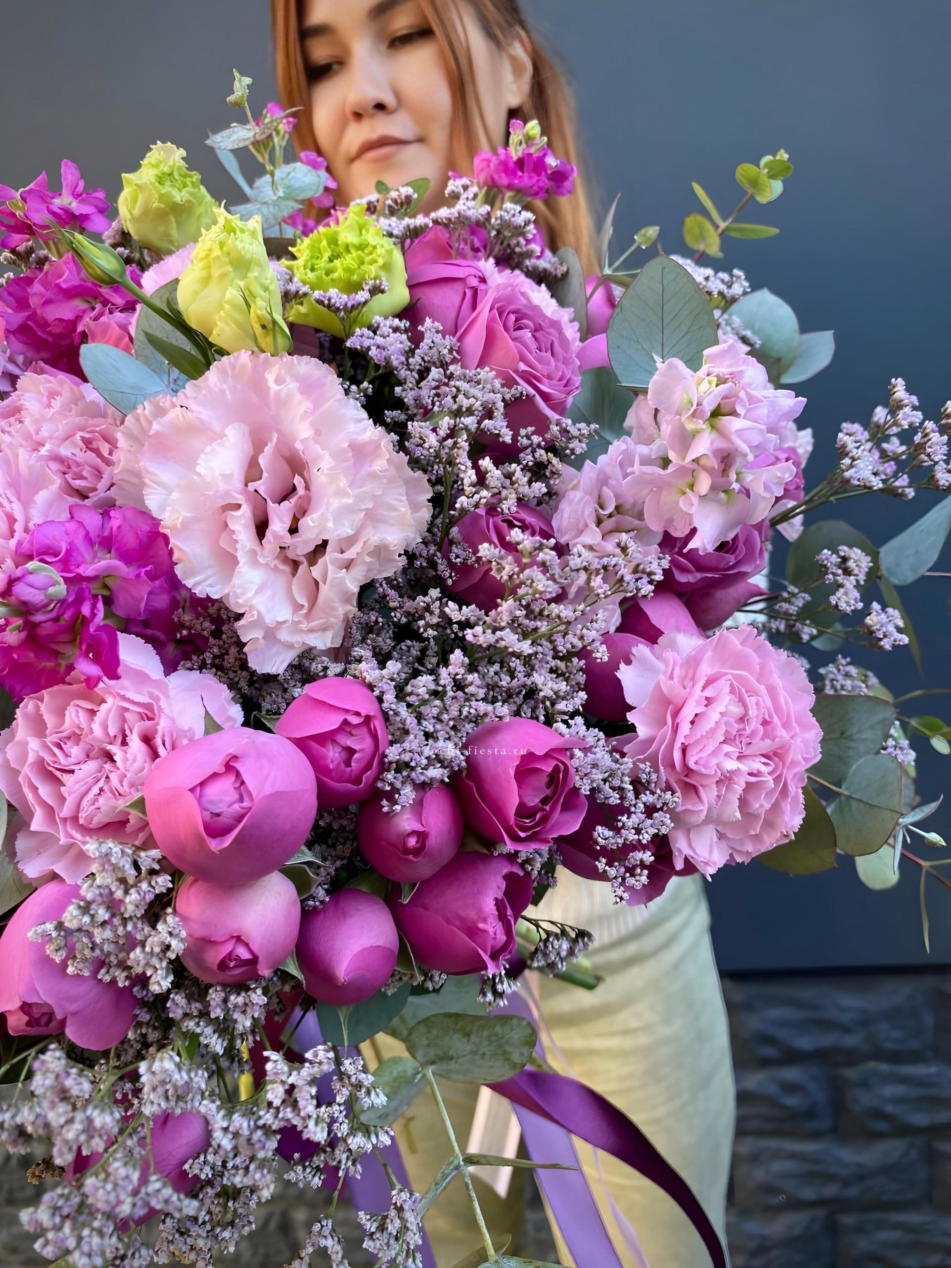 маттиола, диантусы, пионовидные розы Мисти Баблс, эвкалипт, лимониум, эустома лента, упаковка.