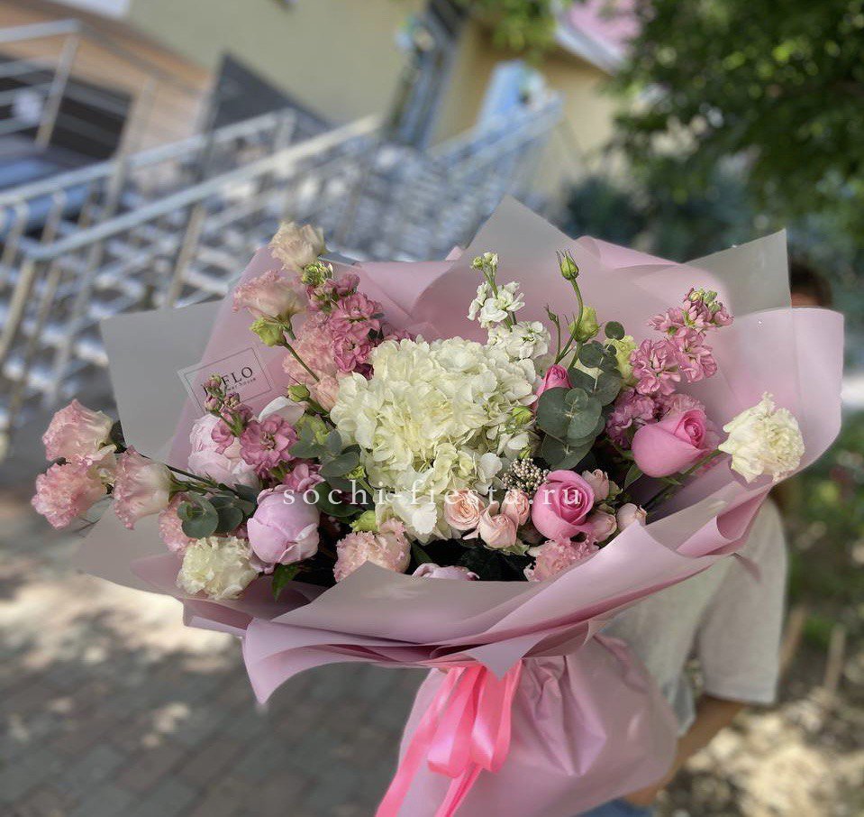 пионы (или аналог вне сезона), розы, гортензия, кустовые розы, эустома, маттиола, декоративная зелень, лента, дизайнерская пленка.