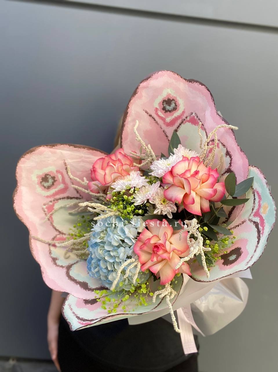 гортензия, джумилия, хризантема кустовая, гипсофила, эвкалипт, амарантус (или аналог), дизайнерское оформление.