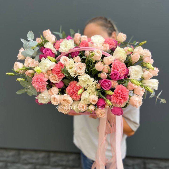 Самые популярные букеты в Томске — это моно-букеты из 15, 25 и 51 розы, шляпные коробки с гипсофилой, композиции с пионами в сезон, свадебные букеты под эскиз, простые авторские миксы с эвкалиптом.