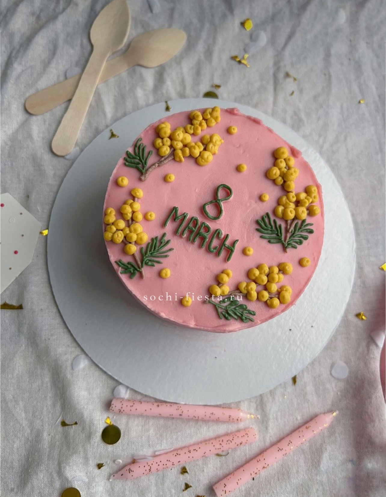 Весенний бенто-торт в бело-розовых тонах с акцентом на праздничную дату. Кремовая текстура создаёт лёгкий рельеф и цветочные мотивы. Два вкуса начинки на выбор.